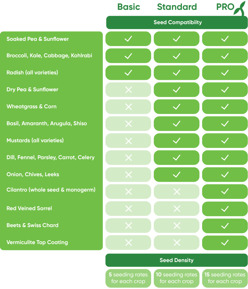 Every aspect of its design was meticulously considered with the microgreens farmer in mind. From its ergonomic design to its quick seed-changing capability, the Little Green Seeding Machine makes microgreens seeding a breeze!